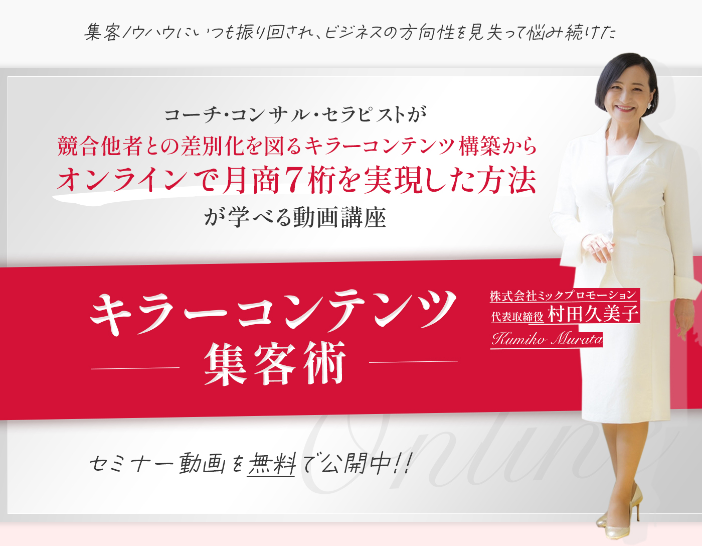 以前の私のように、集客ノウハウにいつも振り回されビジネスの方向性を見失って悩み続けている方にこそ今回はこのキラーコンテンツ集客術を知って欲しくてオンライン動画講座を公開させていただきます。普段は高額なお金をいただいてお伝えしている内容になりますのでいつまで無料で公開できるかは未定なので、今すぐにオンライン講座をお受け取り下さいね。